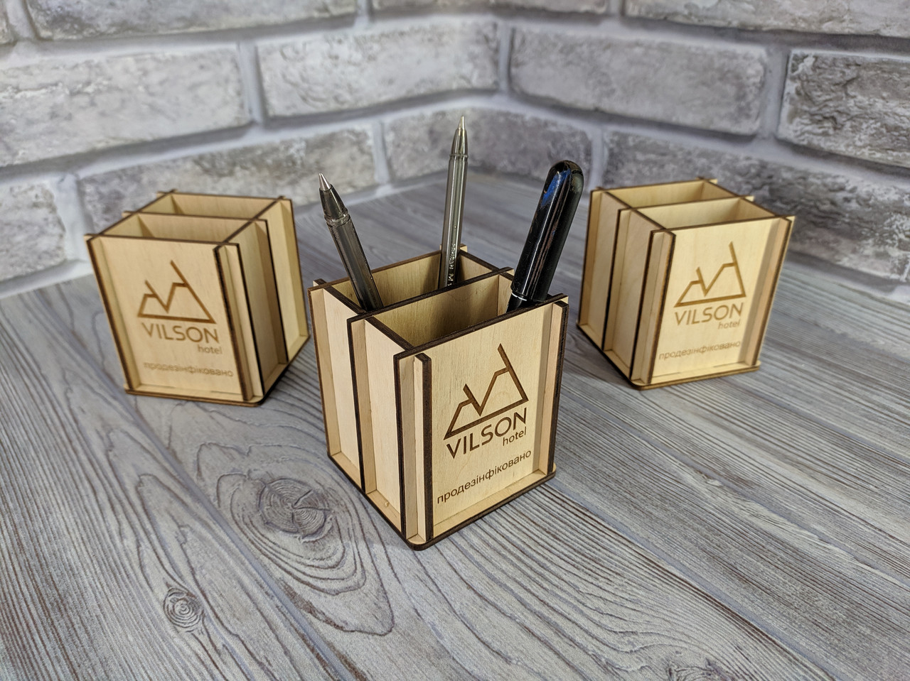Дерев'яну настільну підставку-склянку для канцелярії можна прикрасити ім'ям, малюнком, логотипом або будь-яким іншим зображенням методом лазерного гравіювання, і вона стане прекрасним подарунком або сувеніром для дітей і дорослих. Можливе покриття лаком або морилкою для деревини.
